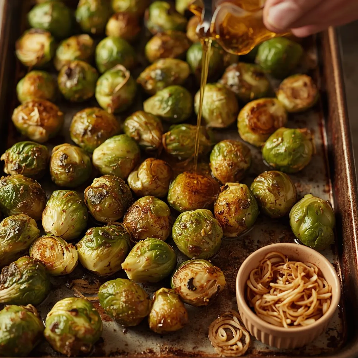 When the Brussels sprouts are done, drizzle them with hot honey while still warm and toss to coat evenly.