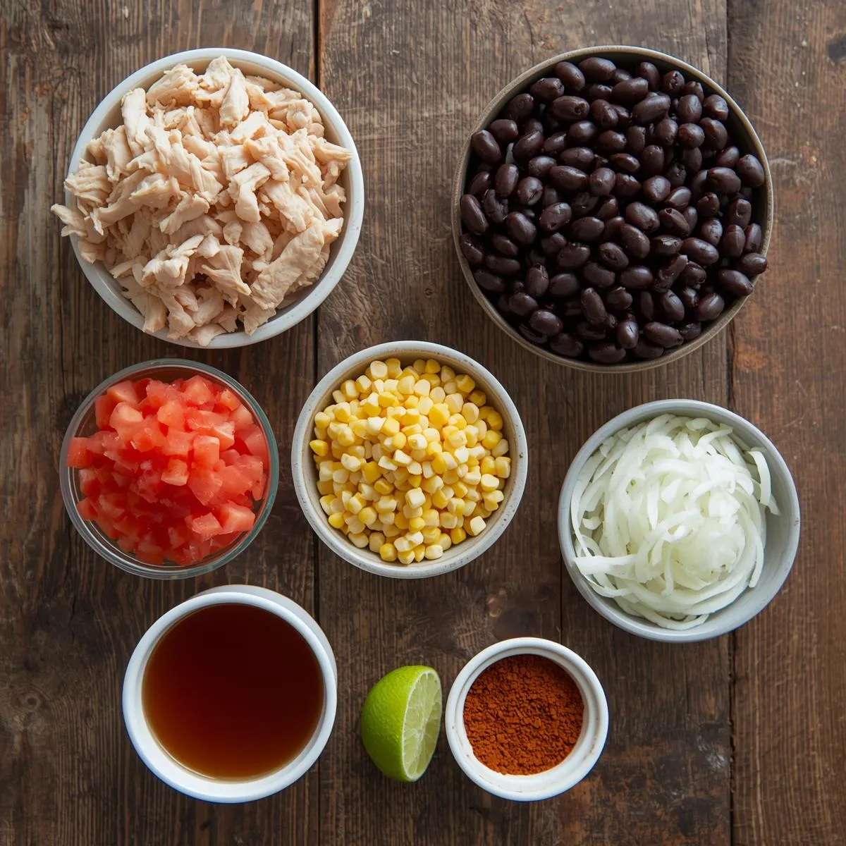 Step 2 – Add the Good Stuff: Stir in shredded chicken, black beans, corn, diced tomatoes, taco seasoning, and chicken broth. Mix well.