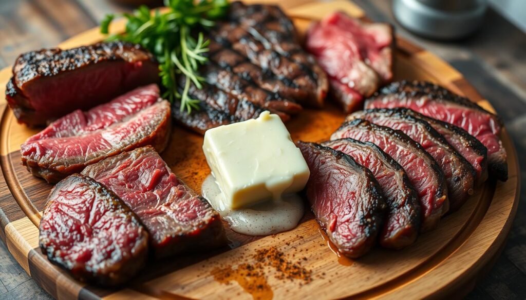 Cowboy butter is made with garlic, fresh herbs, lemon juice, and spices. These add depth to the steak’s flavor, highlighting its natural taste. When using cowboy butter pairing with steak, think about the seasonings and marinades on the meat. Lean cuts like flank steak get a big boost from cowboy butter’s rich flavors.