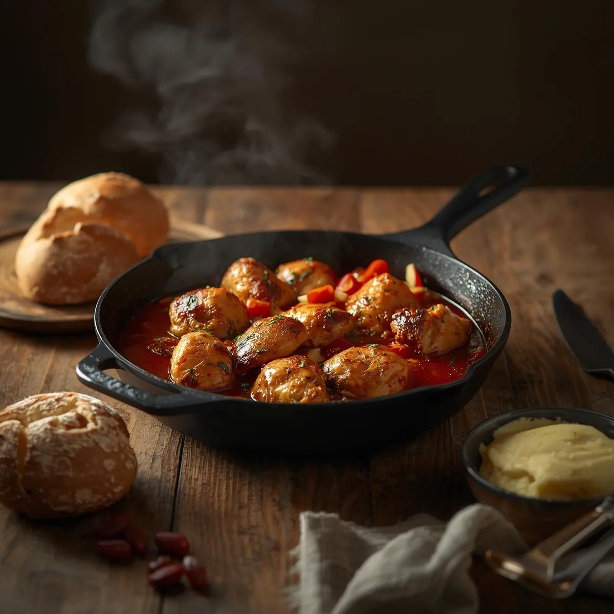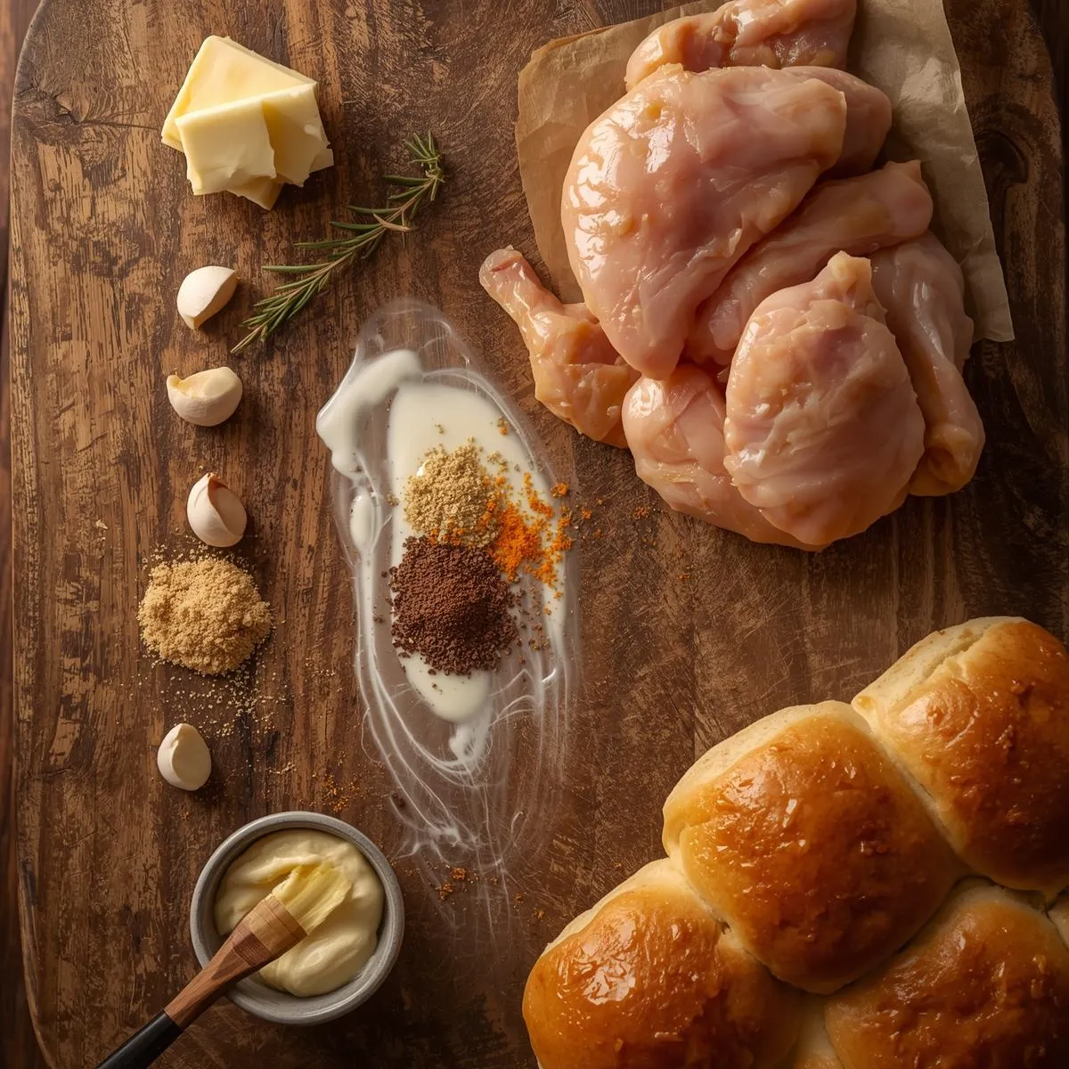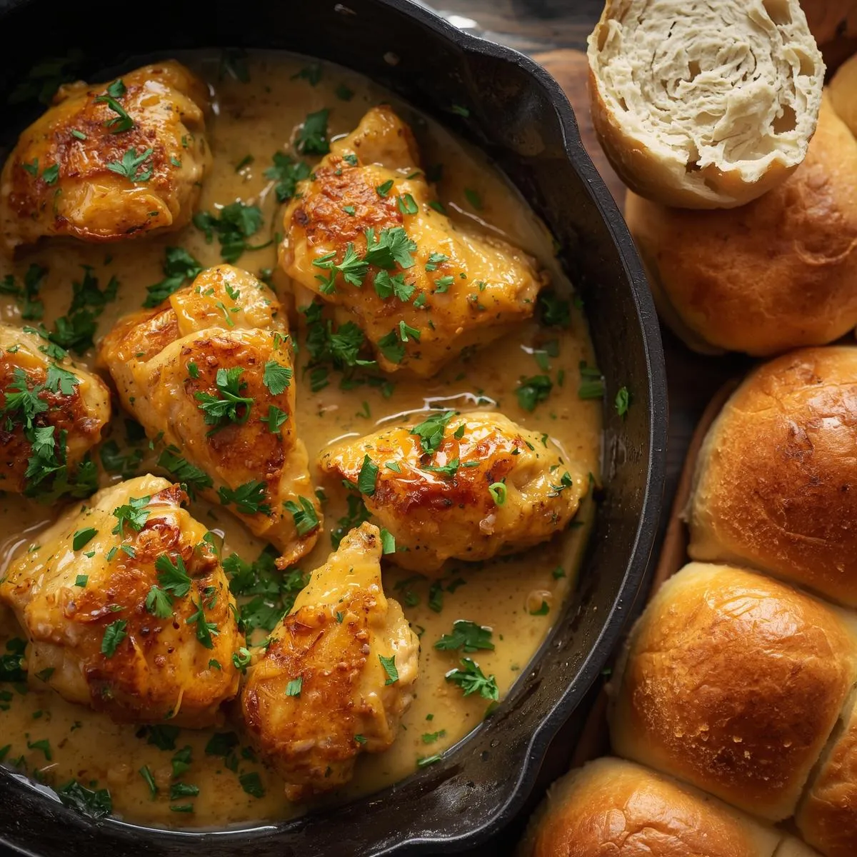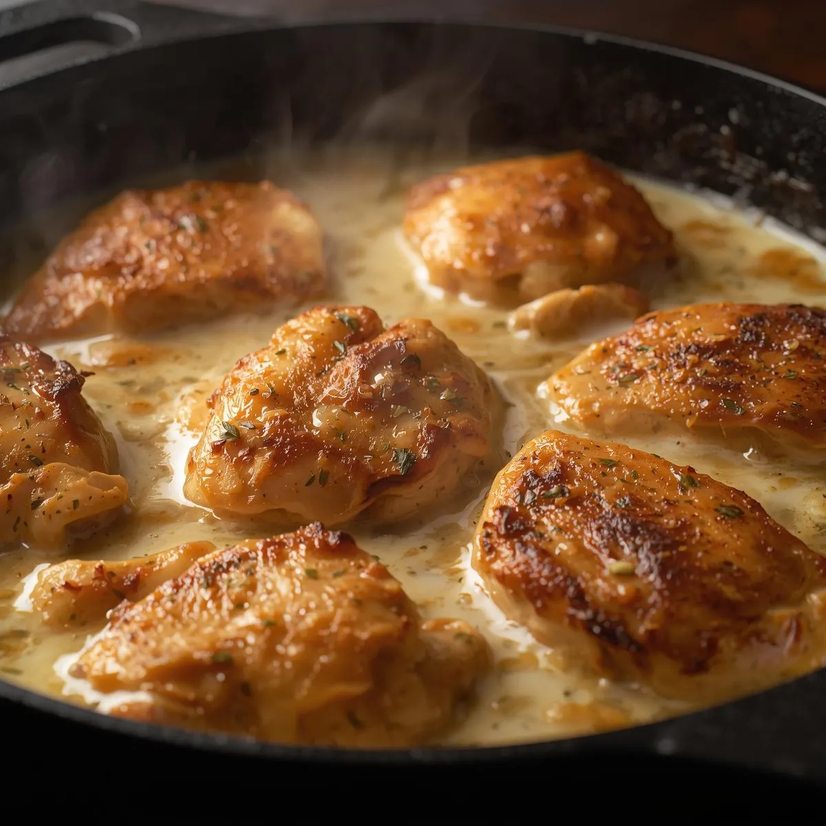 - Season & Sear: Pat chicken dry and season with paprika, onion powder, salt, and pepper. Heat oil and 1 tbsp butter in a skillet, then sear chicken for 4–5 minutes per side until golden. Remove and set aside.