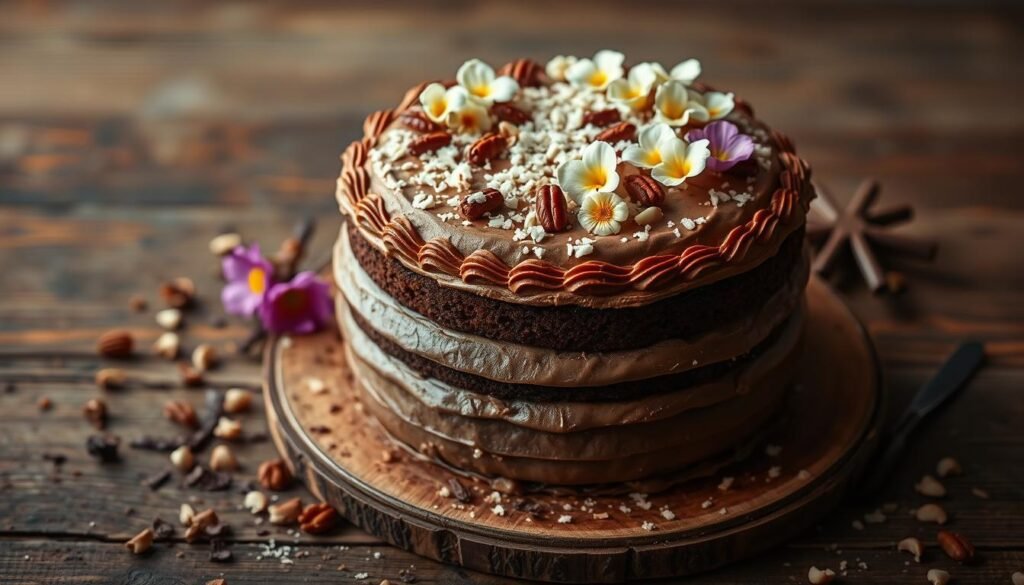 German Chocolate Cake is known for its moist layers. It’s also unique because of its creamy coconut-pecan frosting. Traditional chocolate cakes usually have a chocolate buttercream frosting. But this cake’s special frosting adds a different flavor and texture.