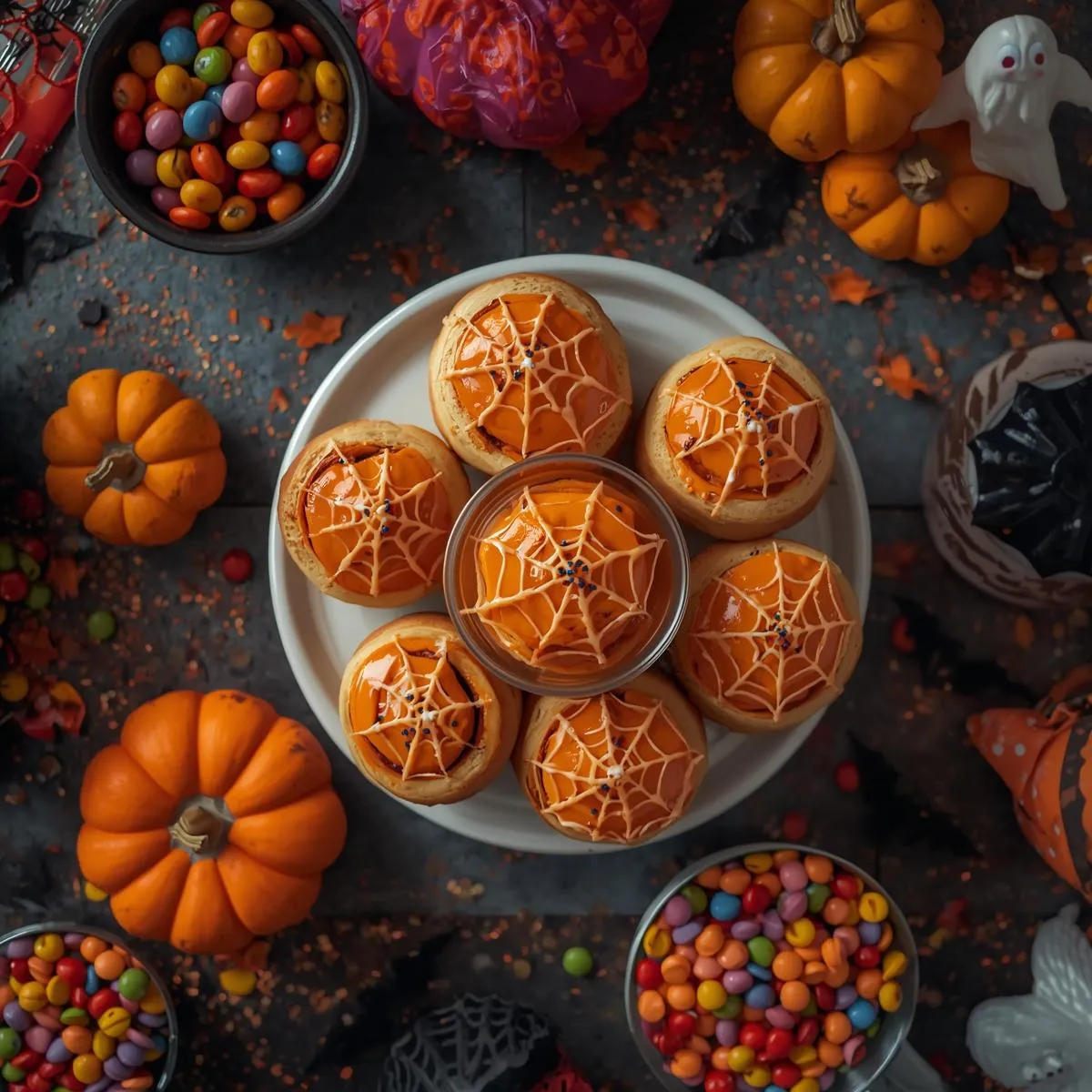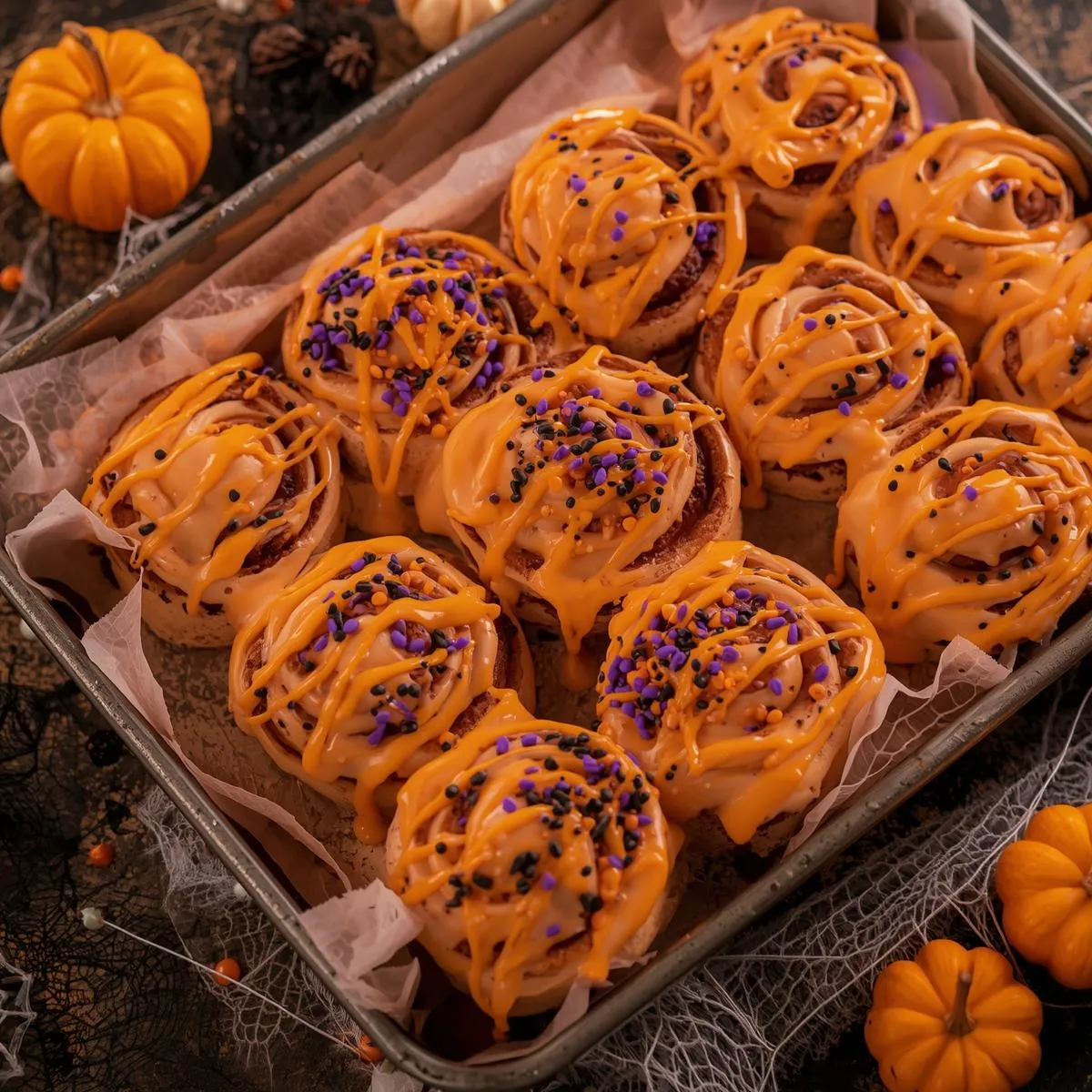They’re classic cinnamon rolls dressed up for spooky season! Soft rolls are baked, then topped with a homemade or store-bought orange frosting. Add Halloween sprinkles, candy eyes, or even chocolate drizzle to make them extra festive.