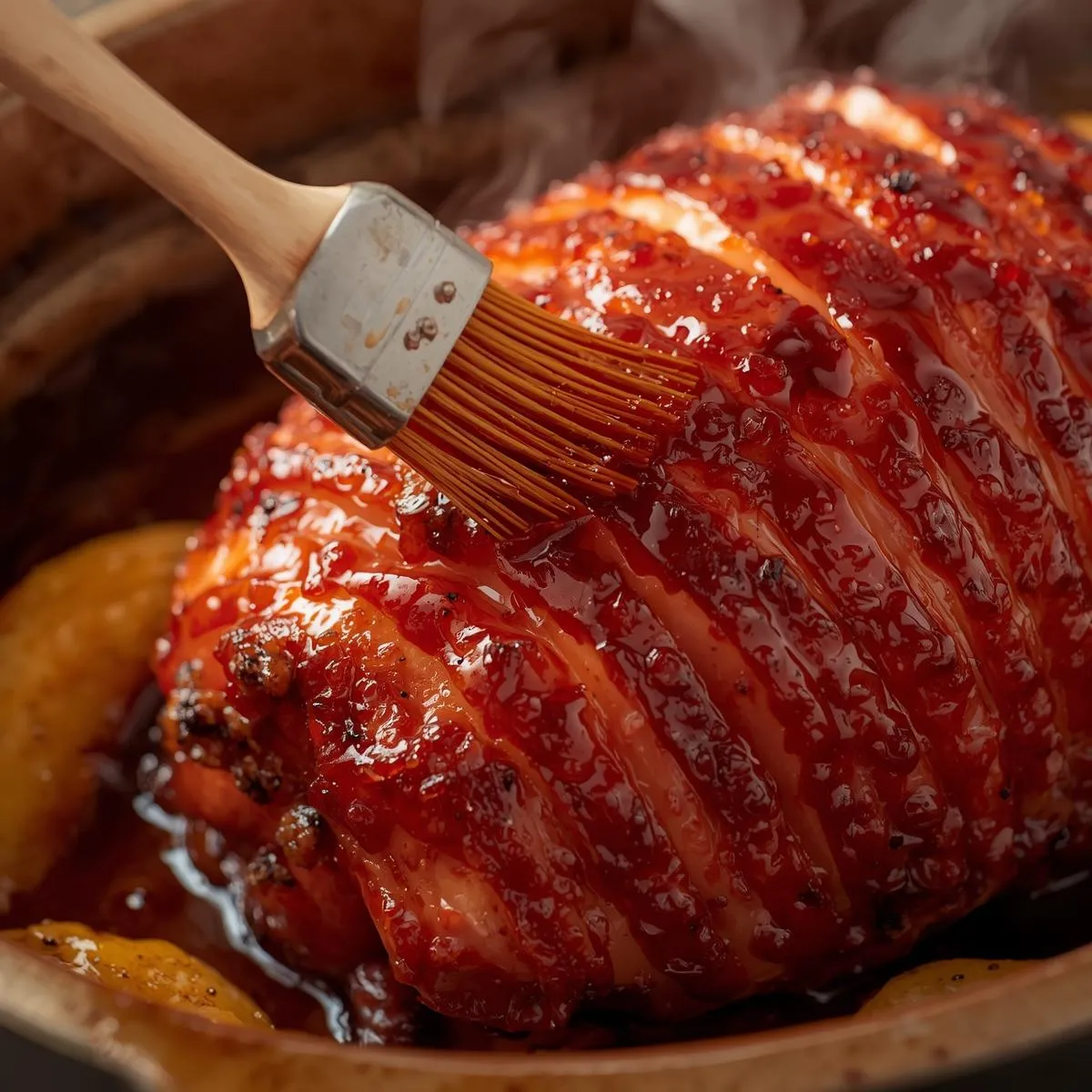 Brush the ham generously with glaze, cover loosely with foil, and bake for 1 hour. Remove foil, brush again with glaze, and continue roasting uncovered for another 30–45 minutes, basting every 15 minutes until glossy and caramelized.