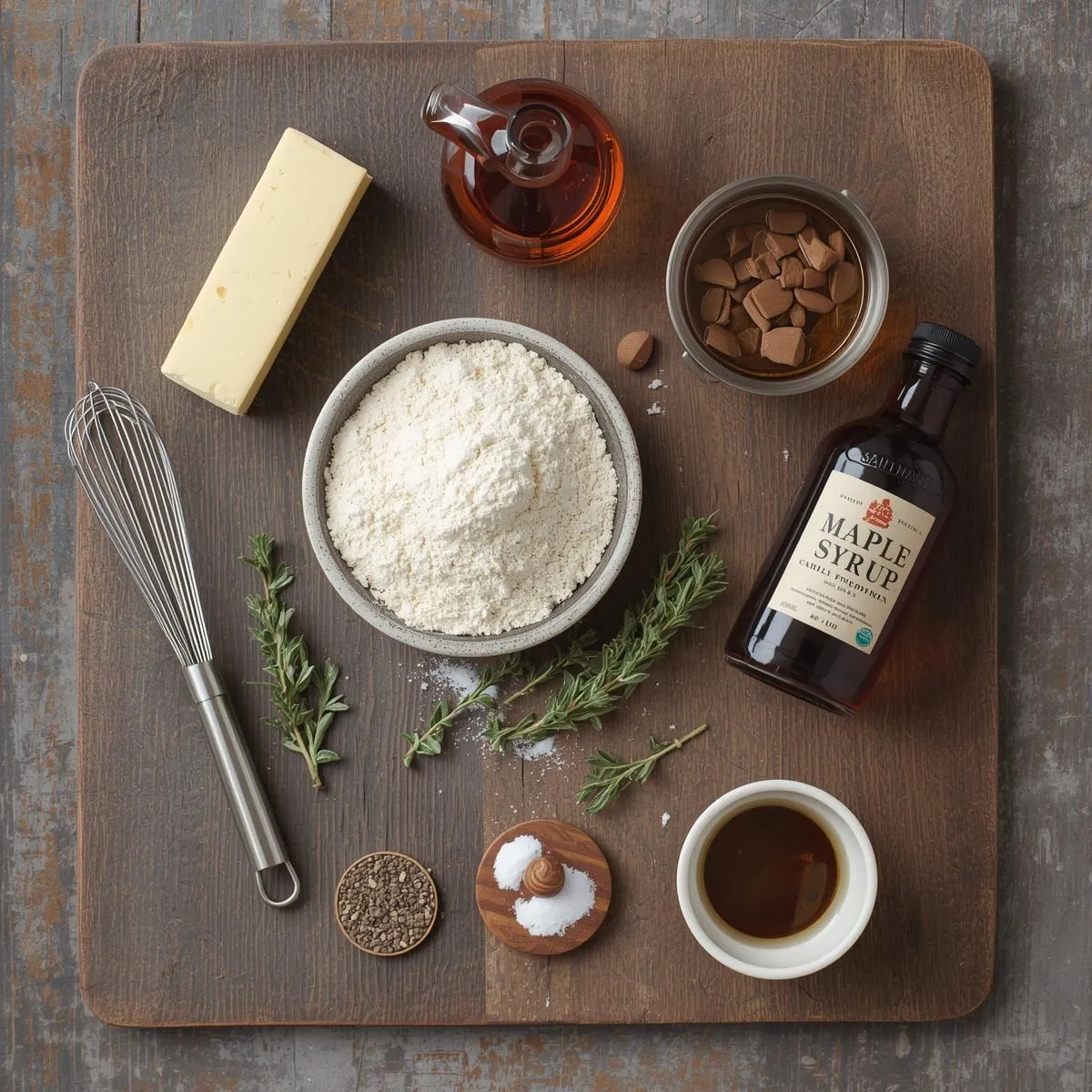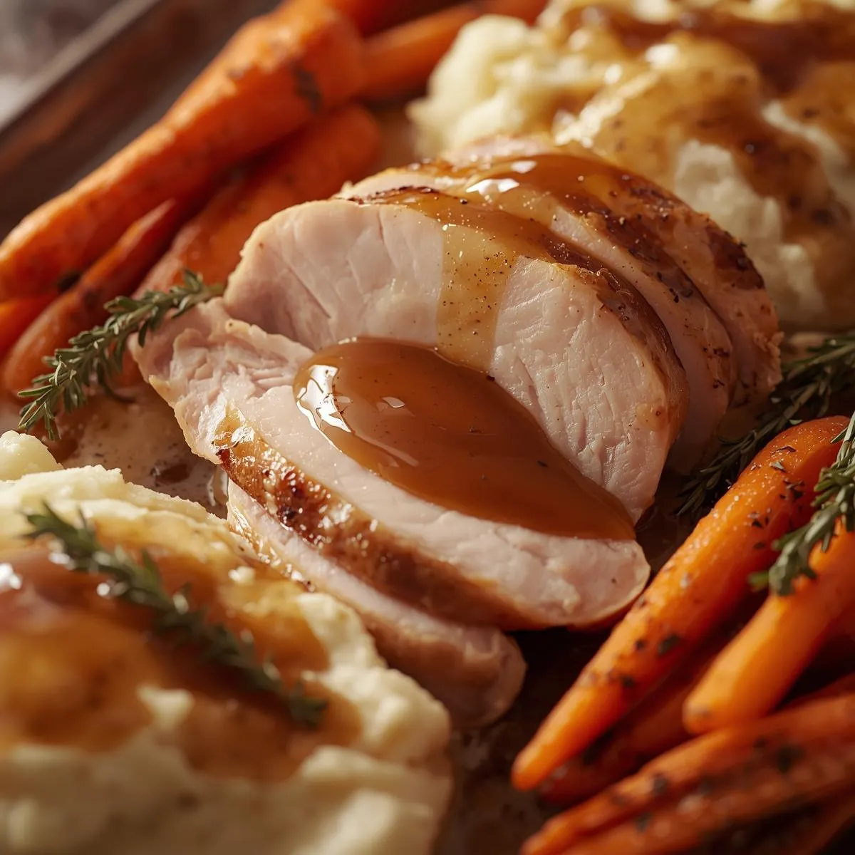 Gradually whisk in the turkey stock and maple syrup until smooth. Add Dijon mustard and thyme, then simmer for 5–7 minutes, whisking occasionally, until the gravy thickens.