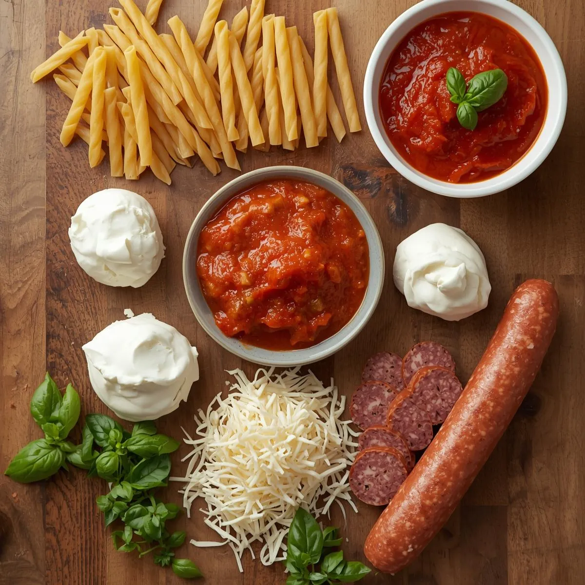 - Prepare meat sauce – In a skillet, cook sausage until browned. Stir in marinara, tomato sauce, and Italian seasoning. Simmer 10 minutes.