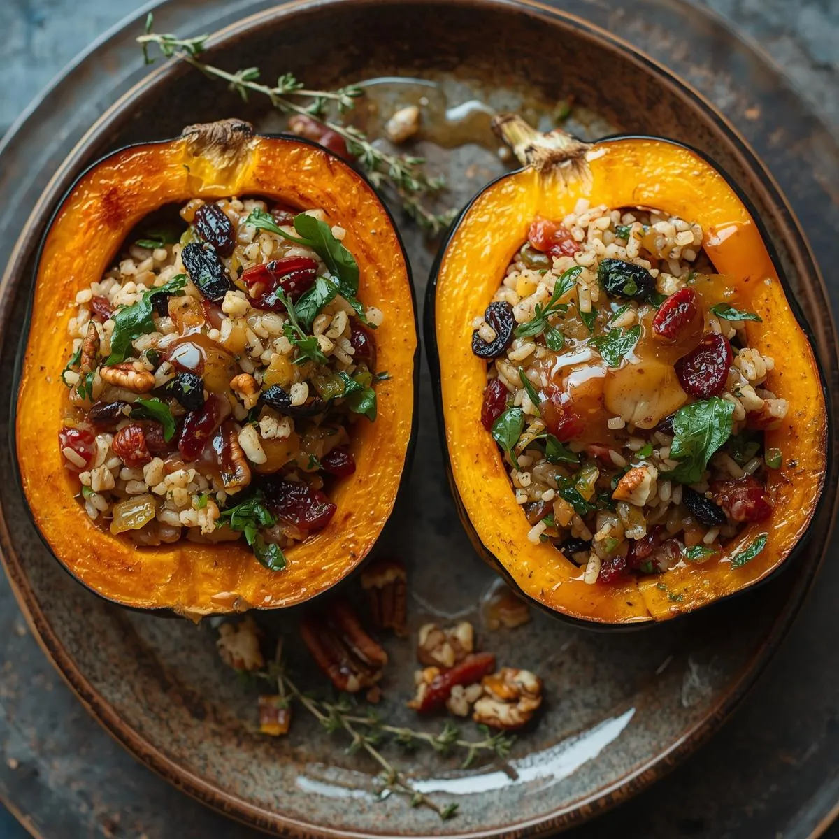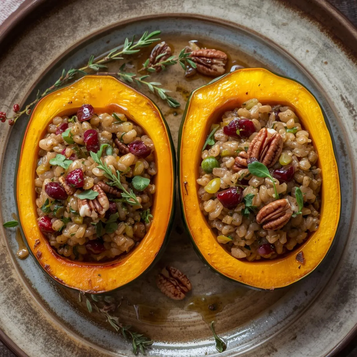 Stuffed Acorn Squash with Wild Rice, Cranberries & Pecans
