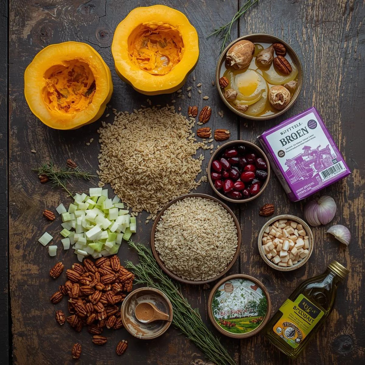 While the squash roasts, heat olive oil or butter in a skillet over medium heat. Add onion and celery and sauté until softened, about 5 minutes. Stir in cooked wild rice, cranberries, pecans, and herbs. Season with salt and pepper. For a touch of sweetness, drizzle with maple syrup before mixing.