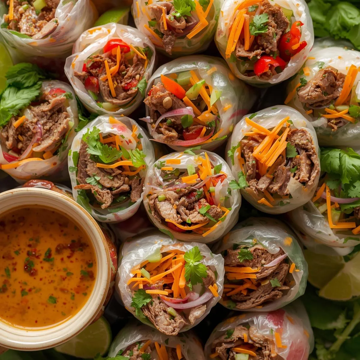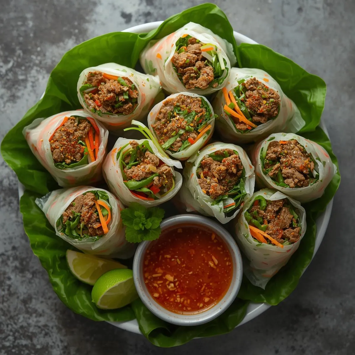 Soften a rice paper wrapper in warm water for about 10–15 seconds until pliable. Lay it on a clean surface. Add a small portion of beef, followed by vegetables, lettuce, and herbs. Fold the sides inward and roll tightly like a burrito. Repeat with remaining ingredients.