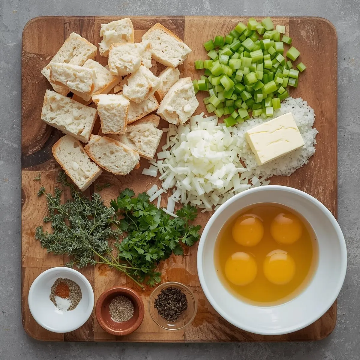 Step 2 – Sauté the Veggies: In a large skillet, melt butter over medium heat. Add onions and celery, cooking until softened (about 5 minutes). Stir in herbs, salt, and pepper, then remove from heat.