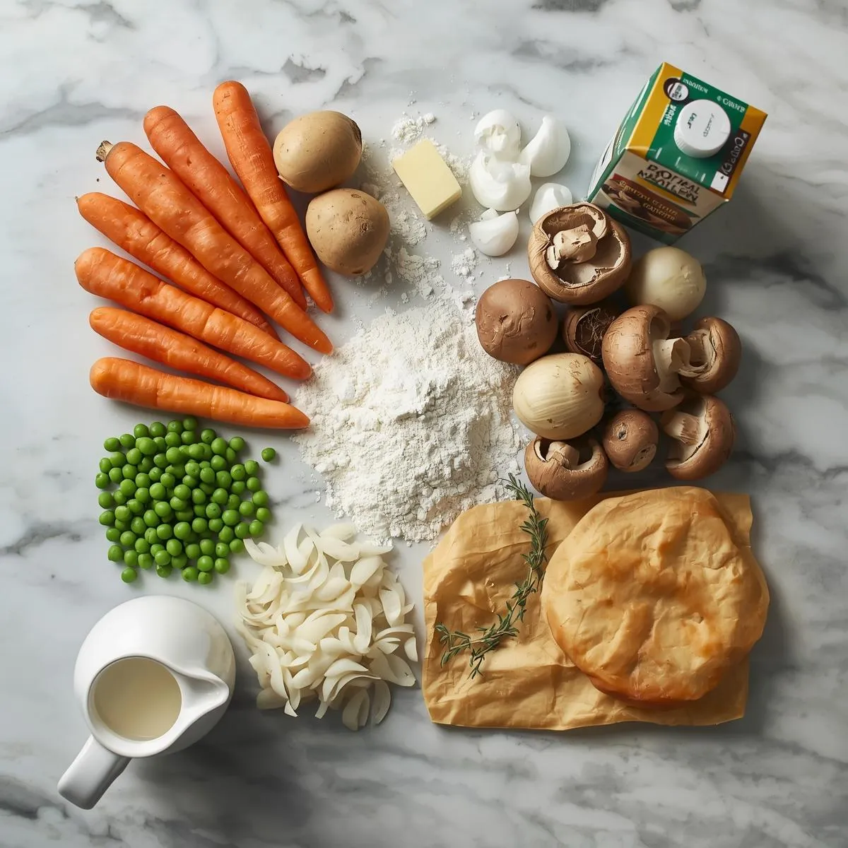 Step 3 – Make the Sauce: Sprinkle flour over the vegetables and stir well. Slowly whisk in vegetable broth and milk until thick and creamy. Season with thyme, rosemary, salt, and pepper. Stir in peas and remove from heat.